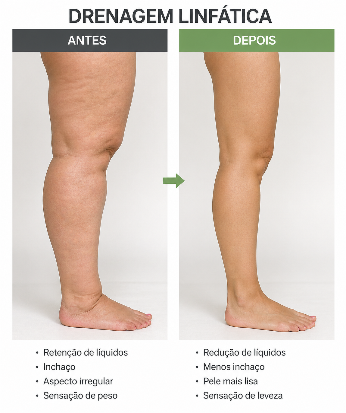Drenagem linfática para redução de inchaço, melhora da circulação, eliminação de toxinas e sensação de leveza no corpo.