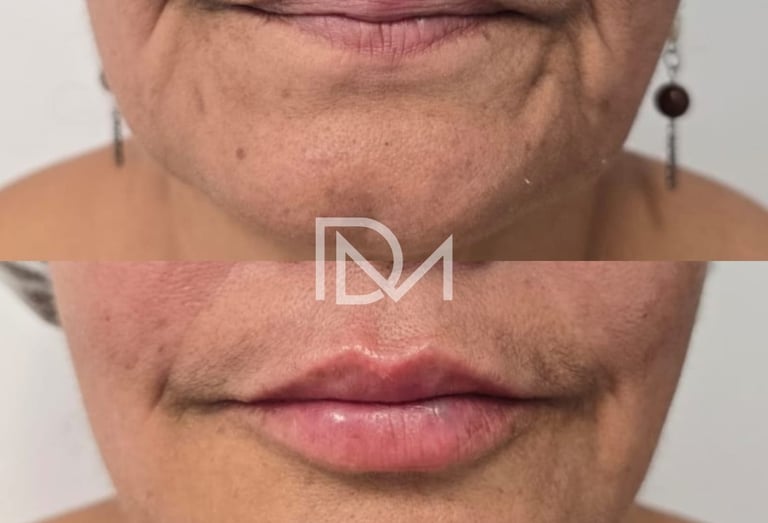 Preenchimento de código de barras com ácido hialurônico para suavizar rugas ao redor dos lábios e rejuvenescer a região perioral com naturalidade.