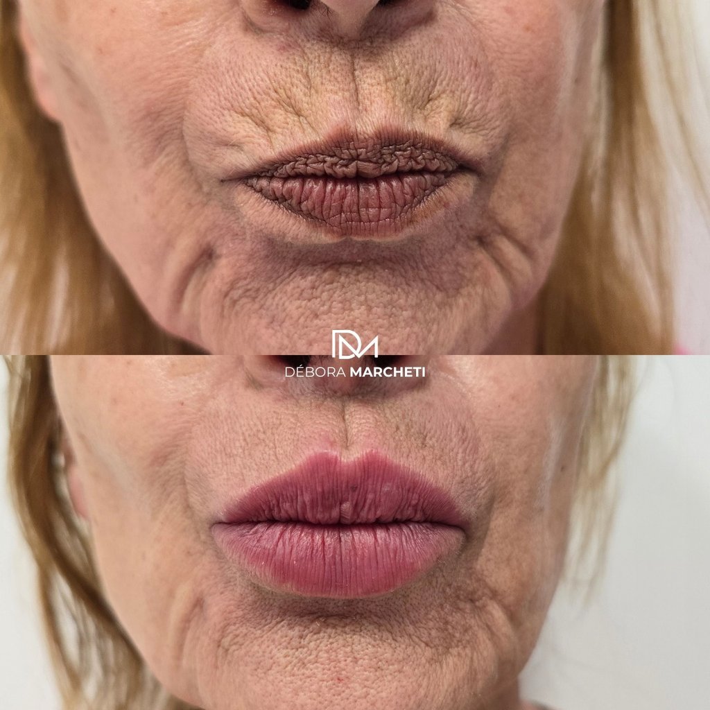Preenchimento de código de barras com ácido hialurônico para suavizar rugas ao redor dos lábios e rejuvenescer a região perioral com naturalidade.